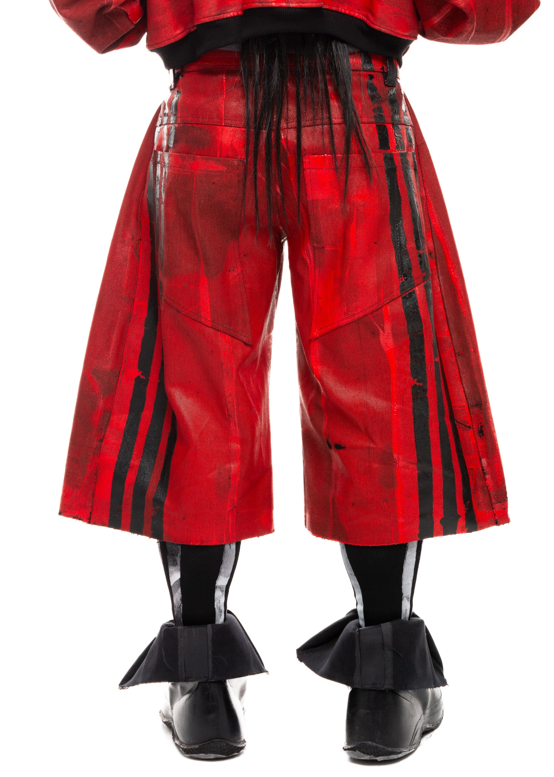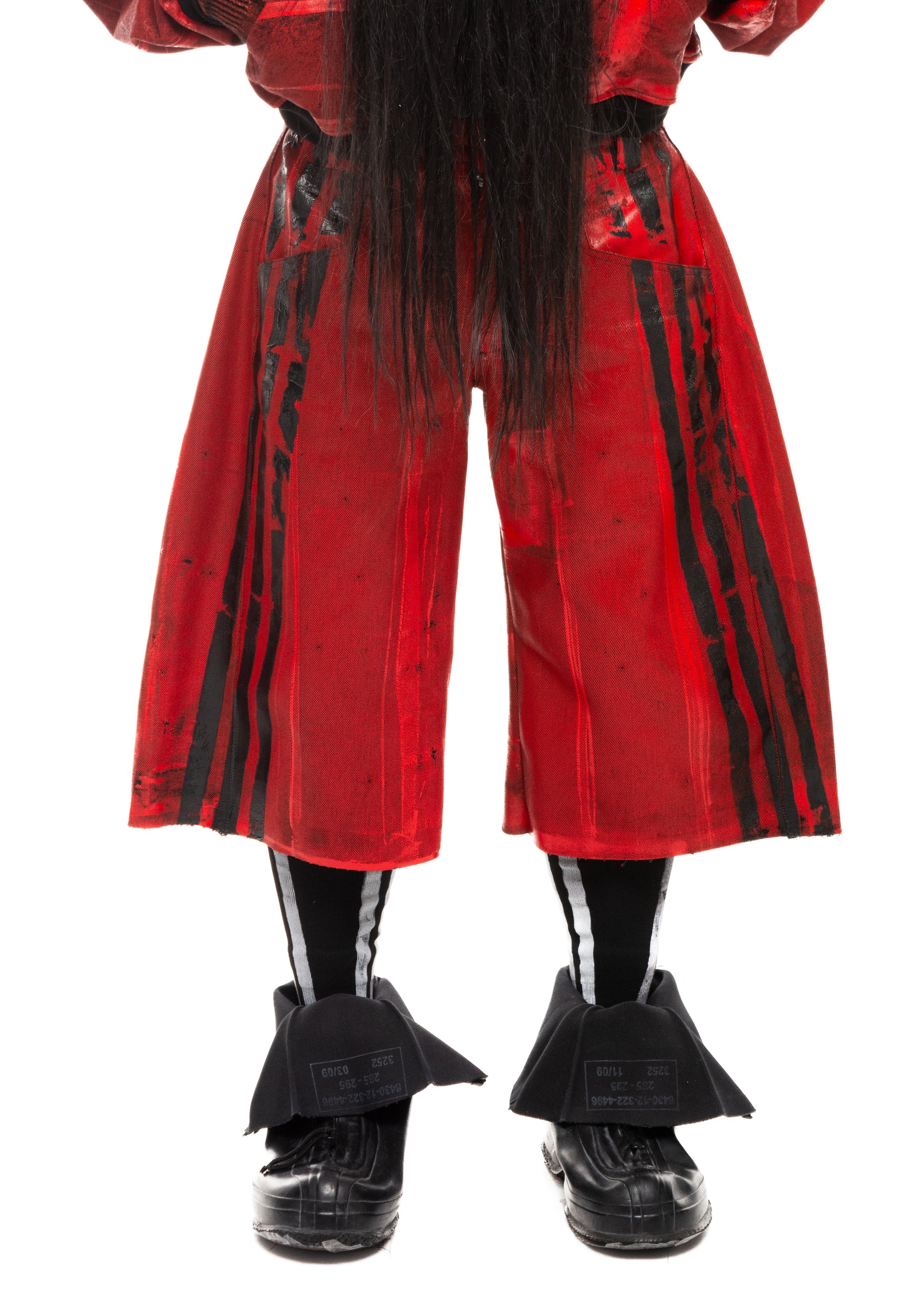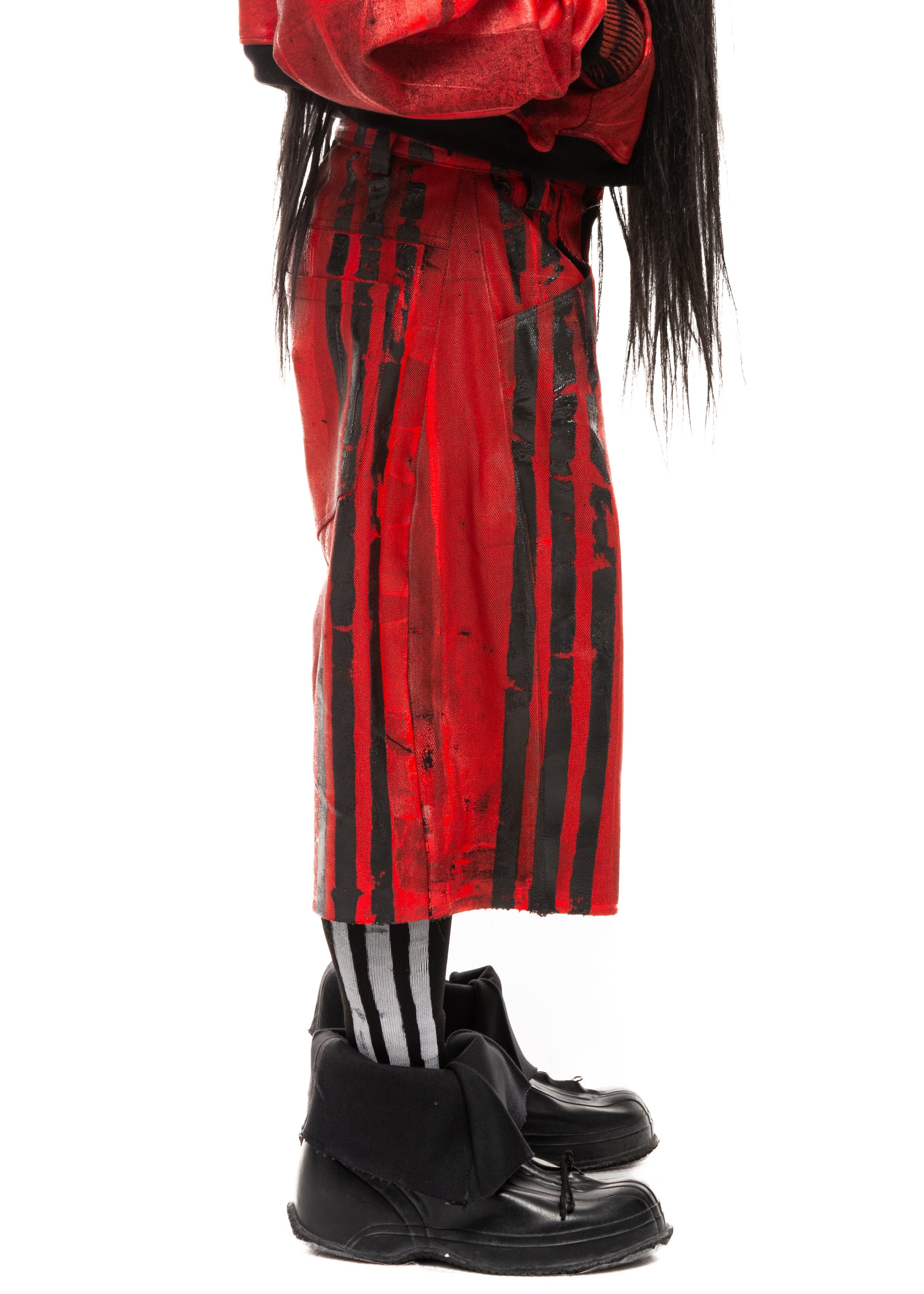 BLACK STRIPES WAXED RED DENIM SHORTS