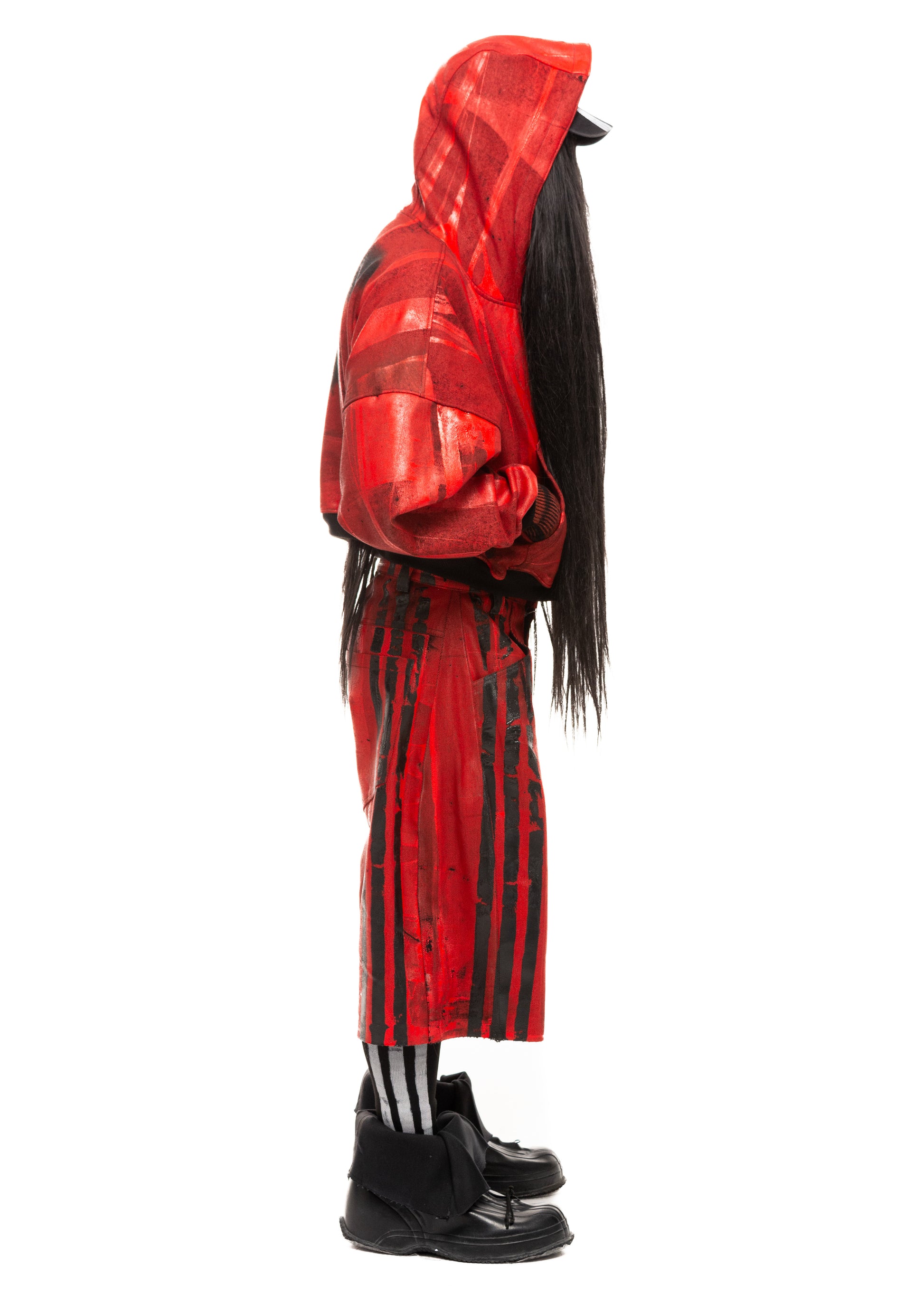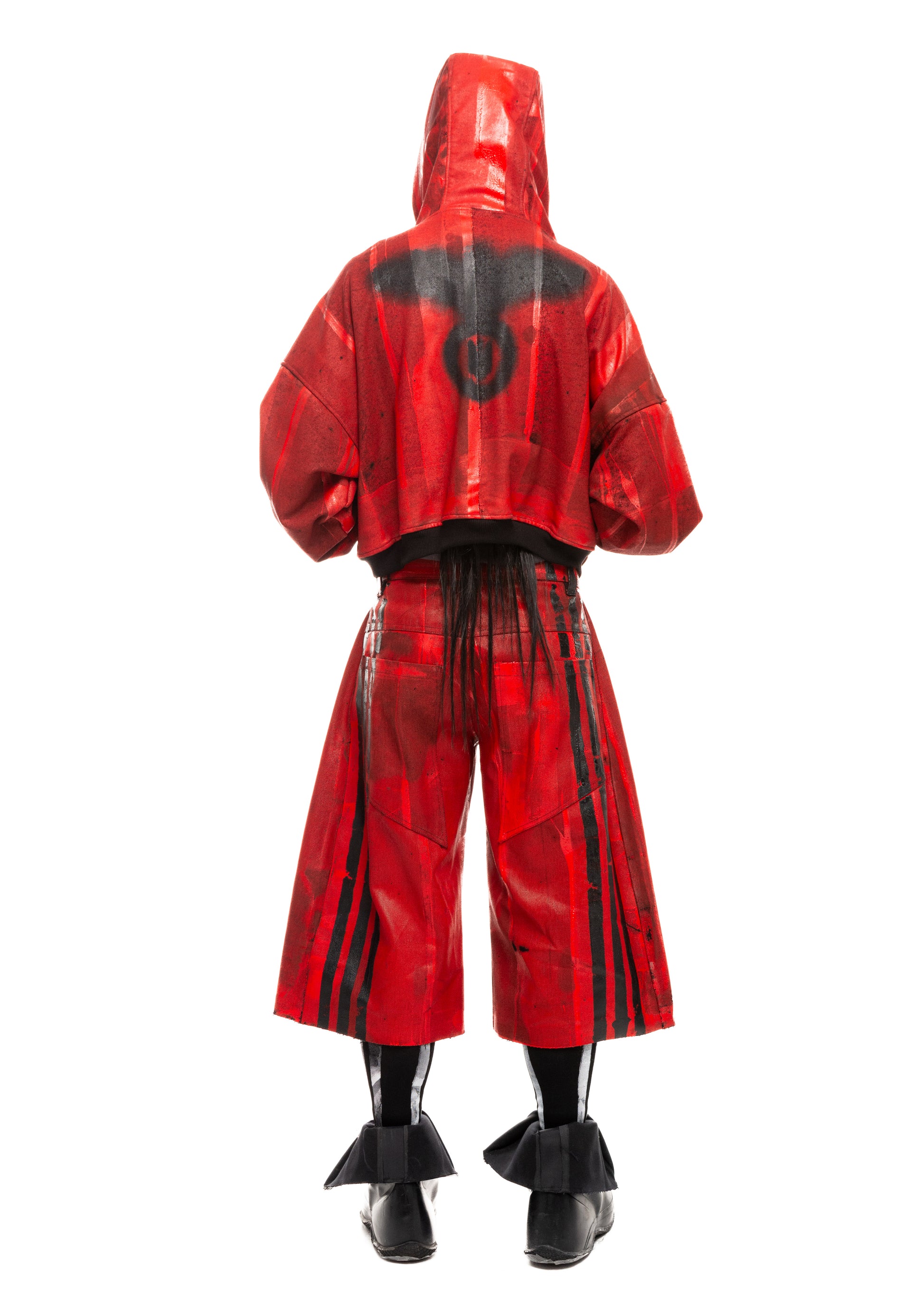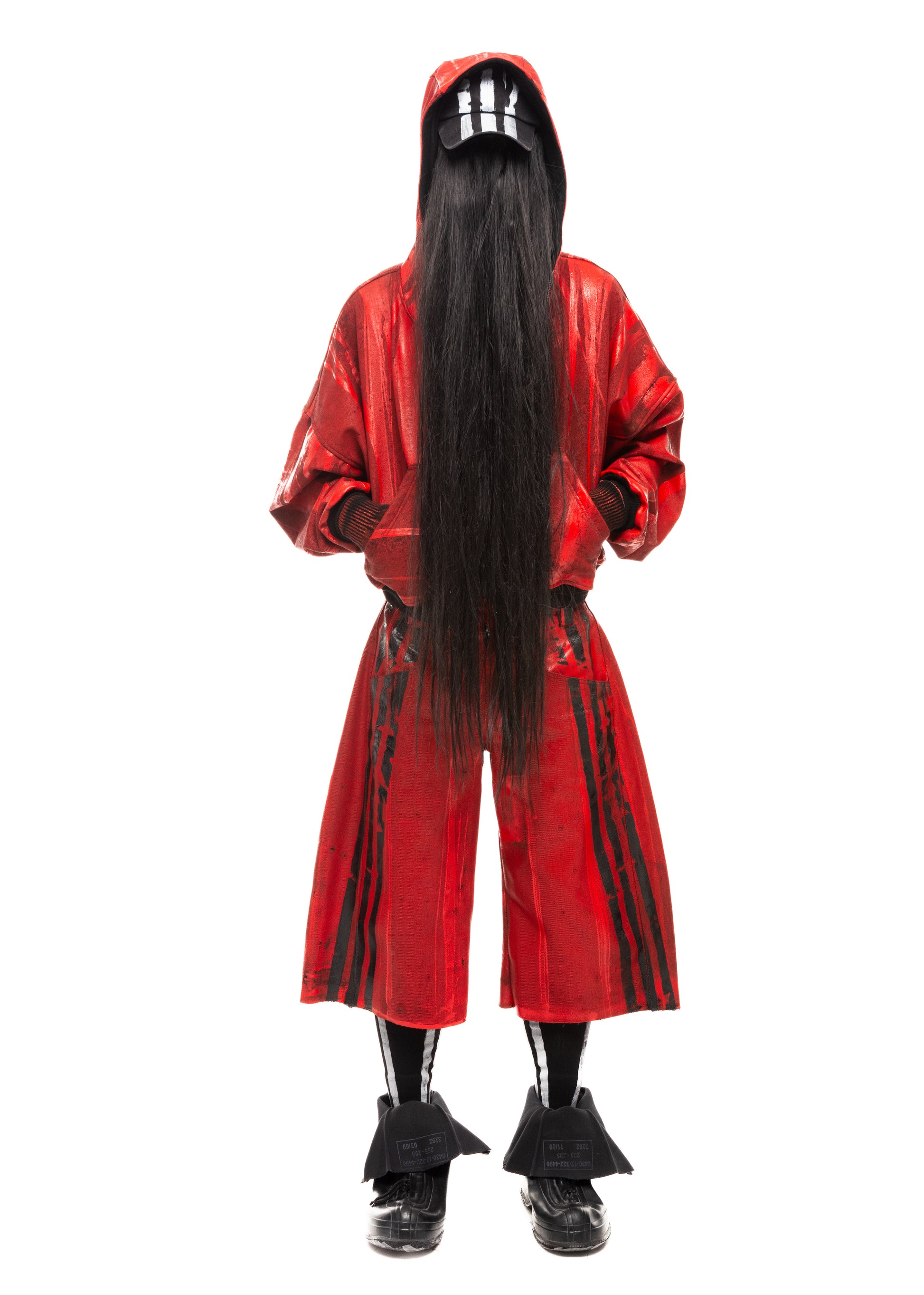 BLACK STRIPES WAXED RED DENIM SHORTS