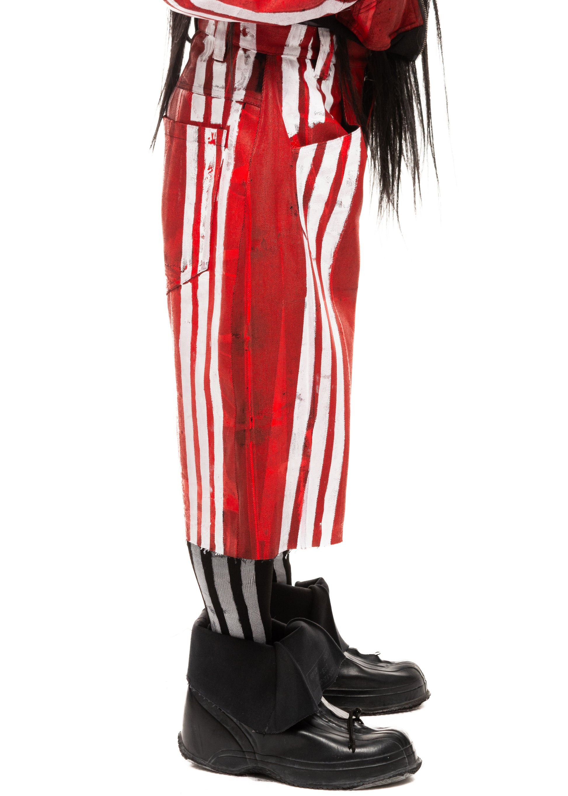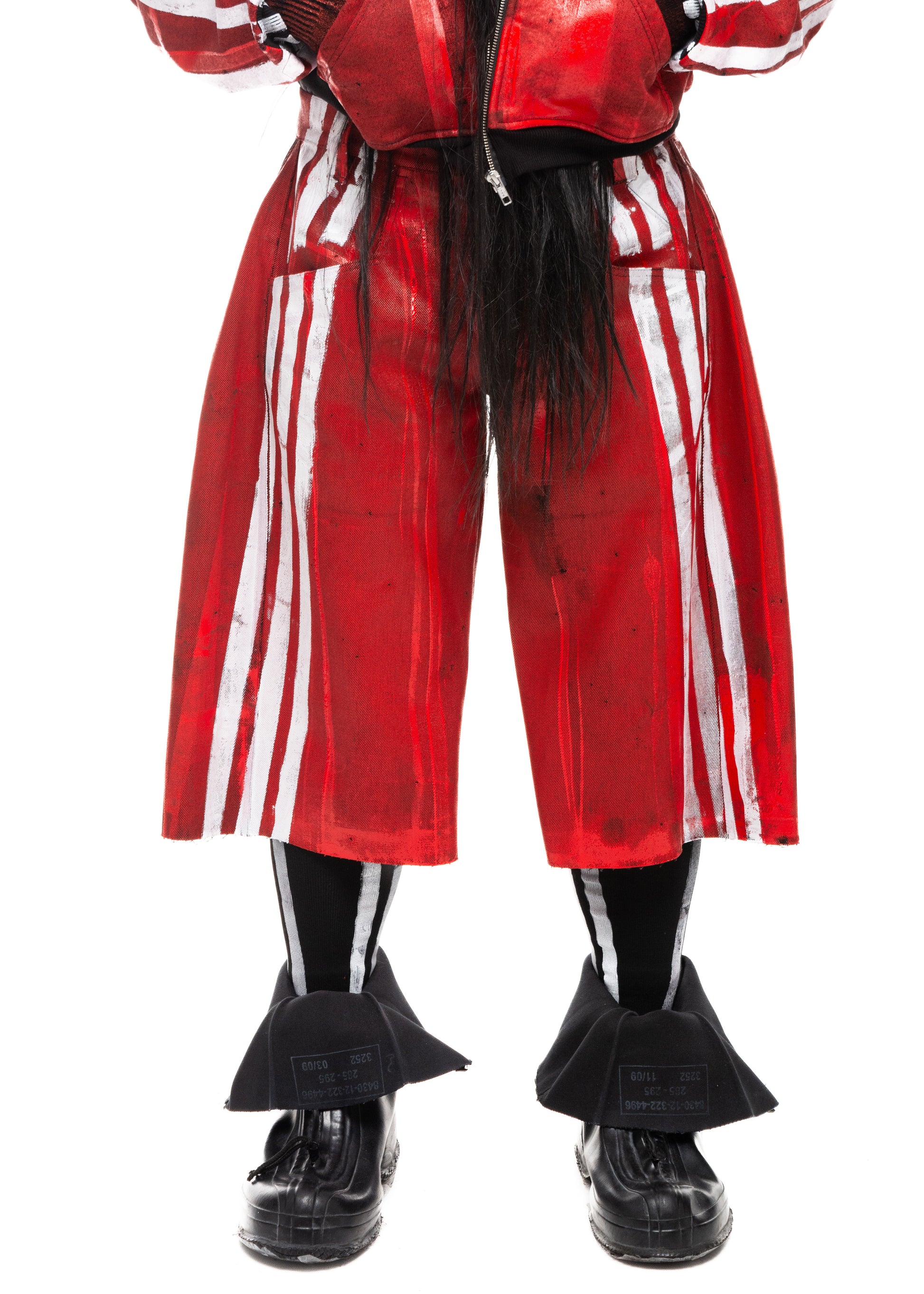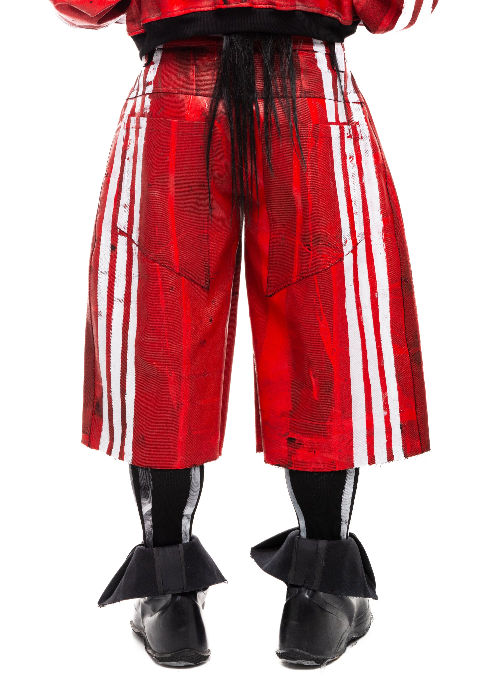 WHITE STRIPES WAXED RED DENIM SHORTS
