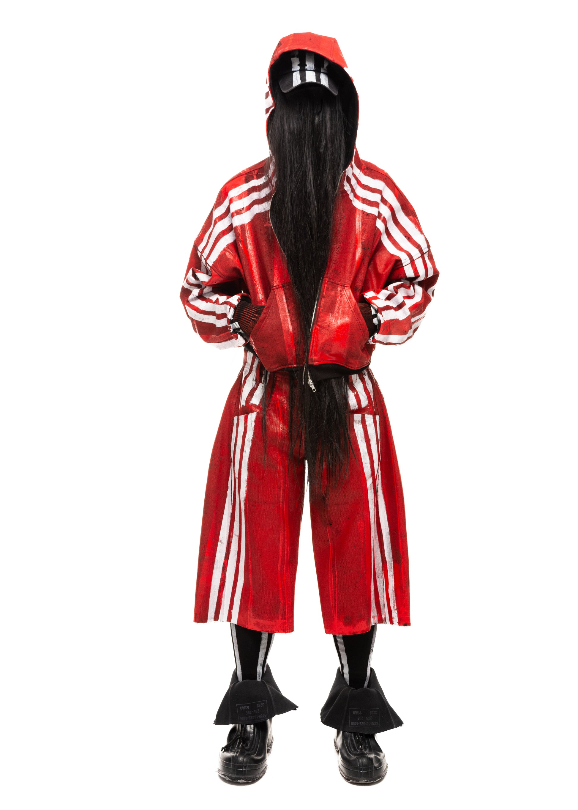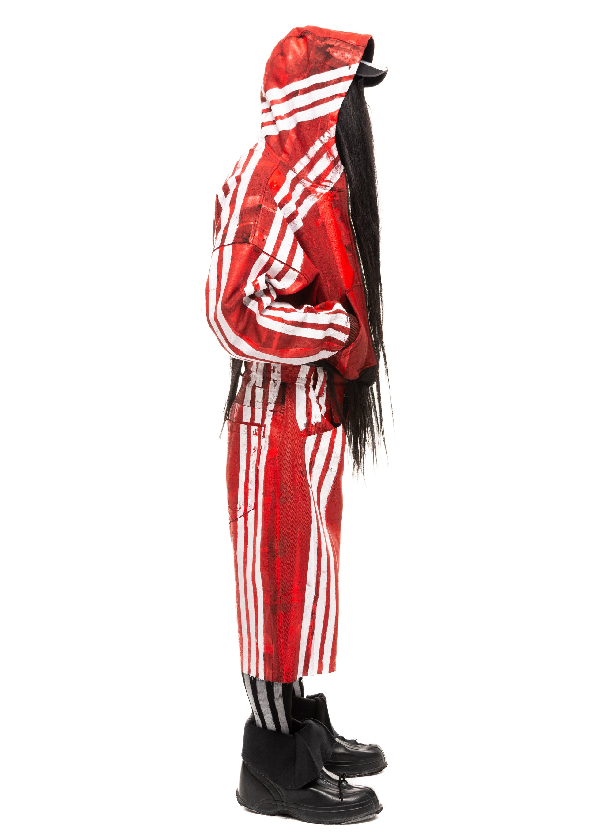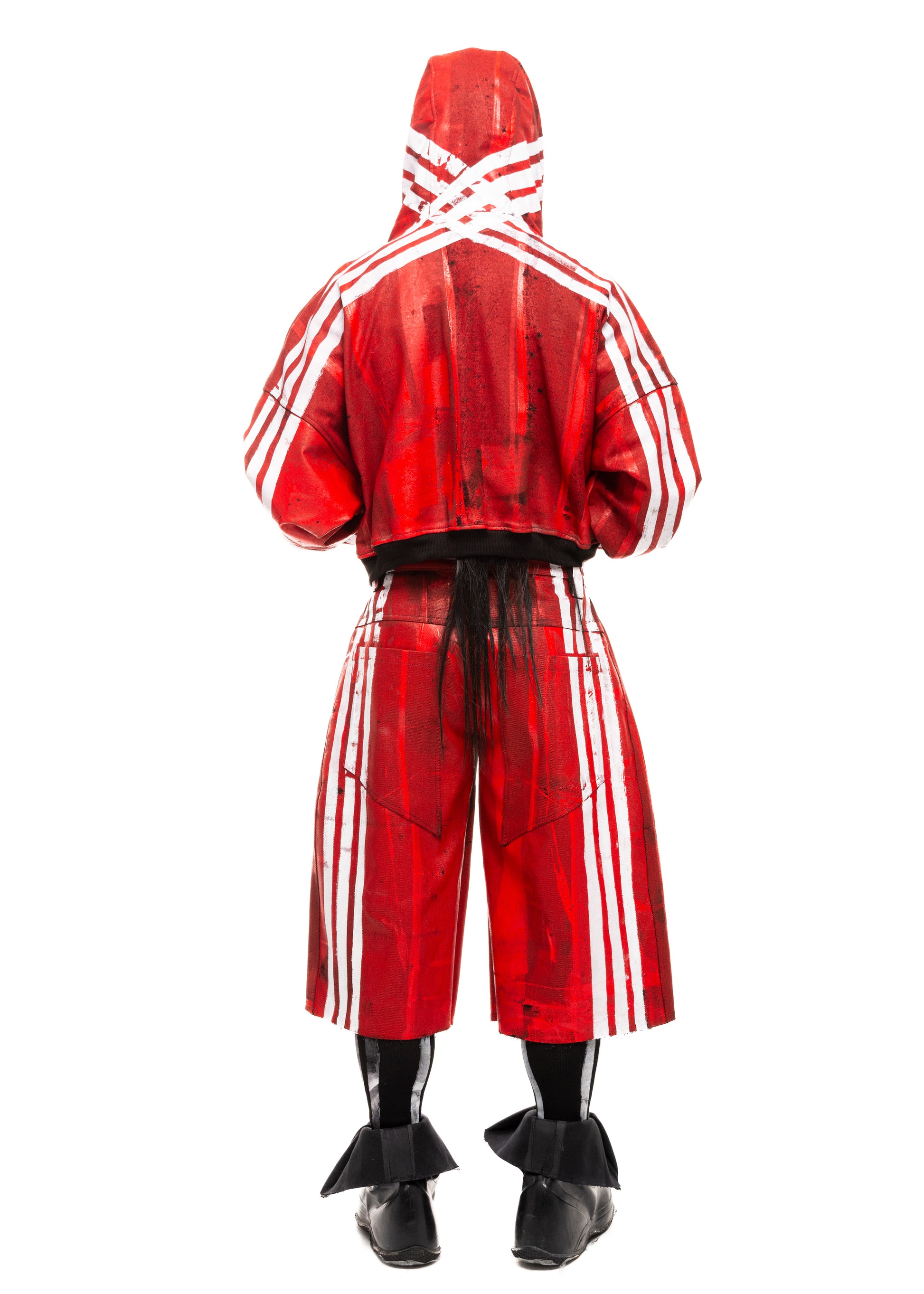 WHITE STRIPES WAXED RED DENIM SHORTS